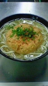天ぷらうどんと言えば、九州では、さつま揚げが乗っていますが、下関では干し海老が入ったかき揚げが乗ったうどんです。